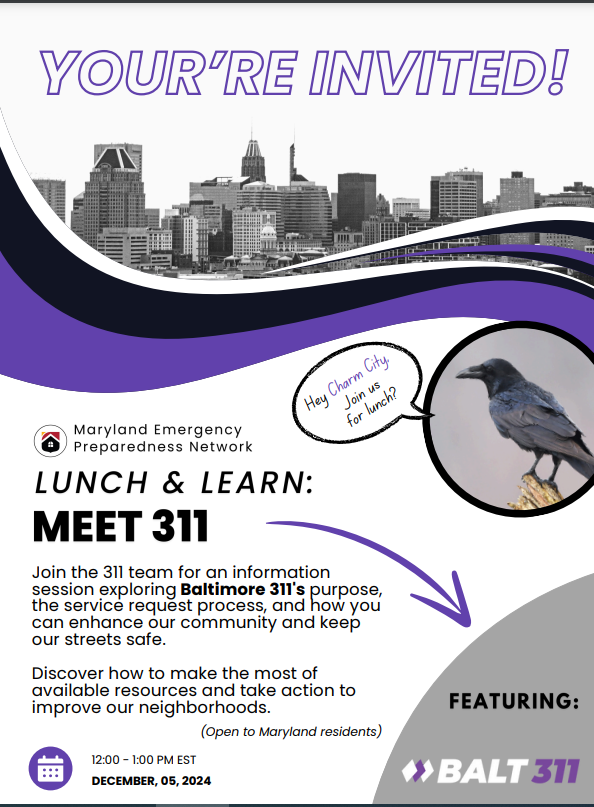 Have you ever wondered when to call 311 instead of 911? Or how 311 fits into your emergency preparedness plan? Join Baltimore City 311 in partnership with the MD Emergency Preparedness Network for a Lunch & Learn Webinar and get the 411 on Baltimore City’s 311 Service – your go-to resource for non...Read more