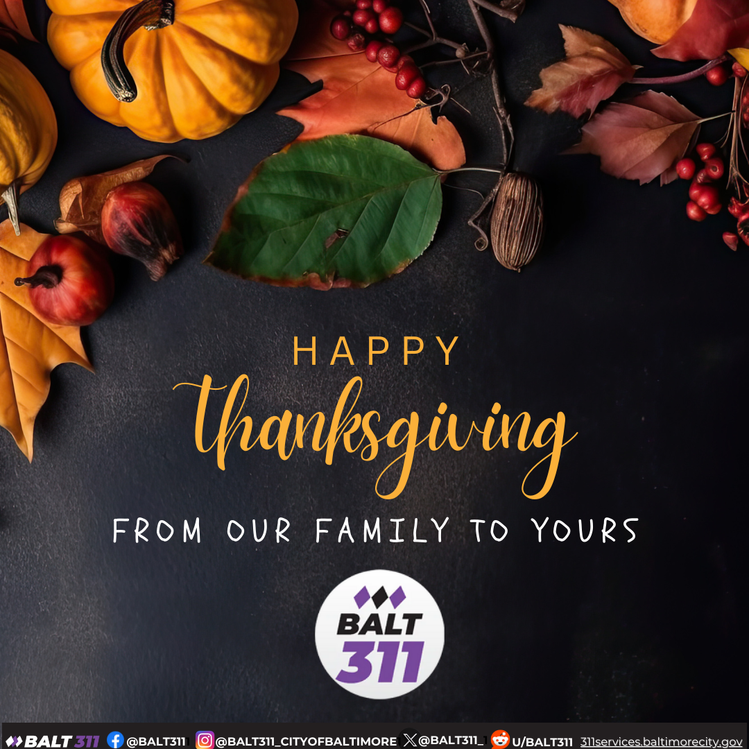 As we approach the Thanksgiving holiday, BALT311 wants to express our gratitude to the Baltimore community. 🍂🦃 We’re thankful for your continued trust and partnership in keeping our city clean and safe. Baltimore 311 is OPEN and ready to assist with your service requests! Wishing everyone a safe a...Read more