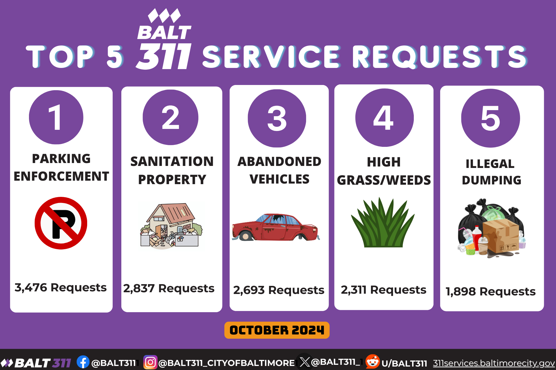 October 2024: Baltimore City’s Top 5 Service Requests Here are the top 5 service requests in Baltimore City for October 2024. Thank you for your timely reports that help us improve and maintain our city. We appreciate your continued support of Baltimore 311!